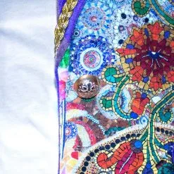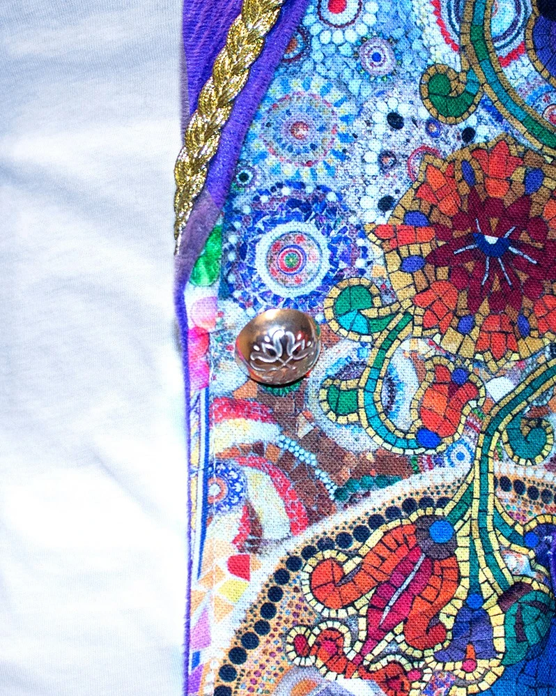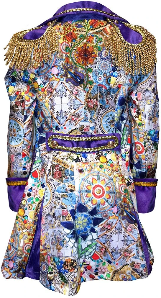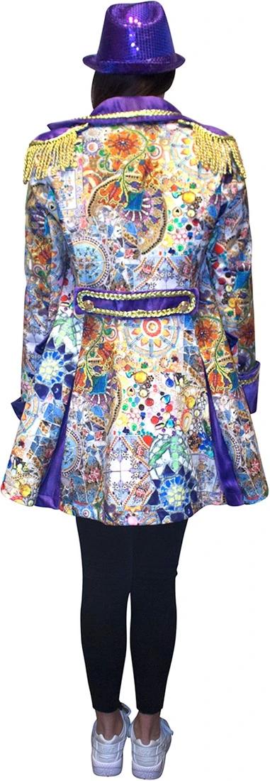 Prachtige gevoerde carnavalsjas voor dames met een diamant- en mozaïek motief. Goed te gebruiken als markiezin jas, maar tevens is de jas geschikt voor elke carnavalsgelegenheid! Aan de voorzijde zitten 2 sierknopen, welke niet bedoeld zijn om de jas te sluiten. Op de schouders zitten epauletten, die ook van de jas af te halen zijn. De jas heeft een paarse voering en is versierd met gouden details. De print-stof is gemaakt van 100% katoen en de voering en paarse kraag van 100% polyester. Ook verkrijgbaar in korte variant en in andere motieven.