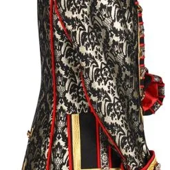 Details: hoge opstaande kraag, 3/4 mouwen en de borst is versierd met goudband en 3 strikken. De rok staat iets uit en is versierd met een rouge