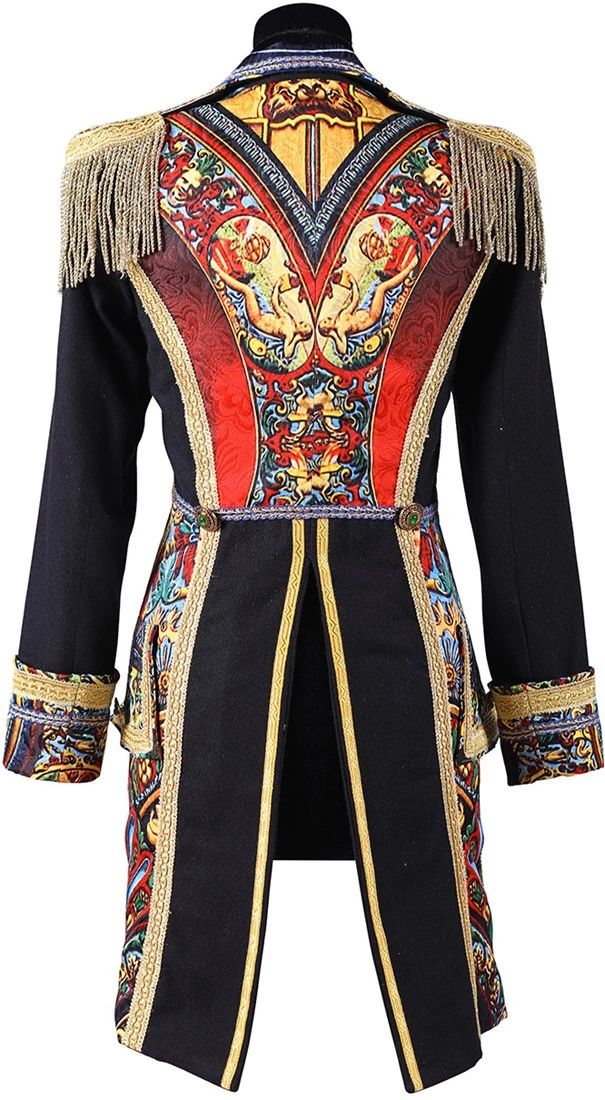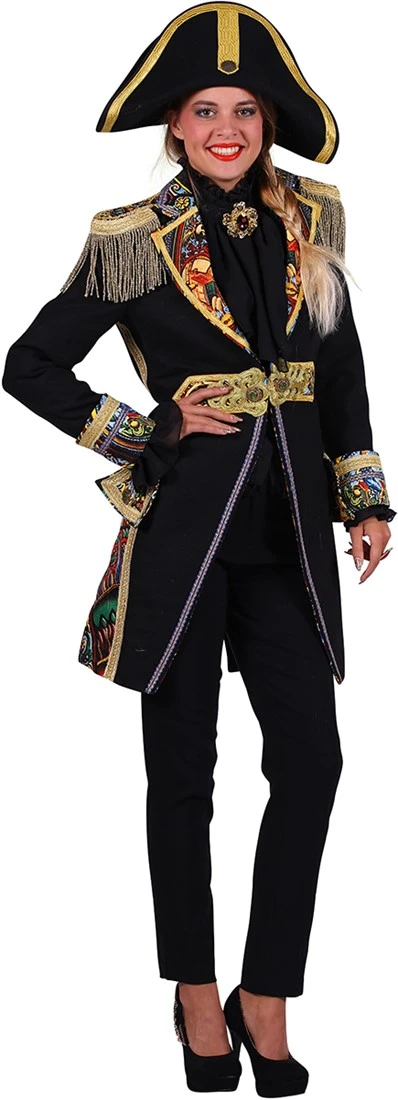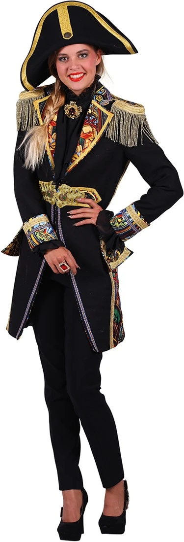 Een prachtige zwarte carnavalsjas met allemaal kleurrijke details. Een mooie damesjas om aan te doen naar een carnavalsfeest!