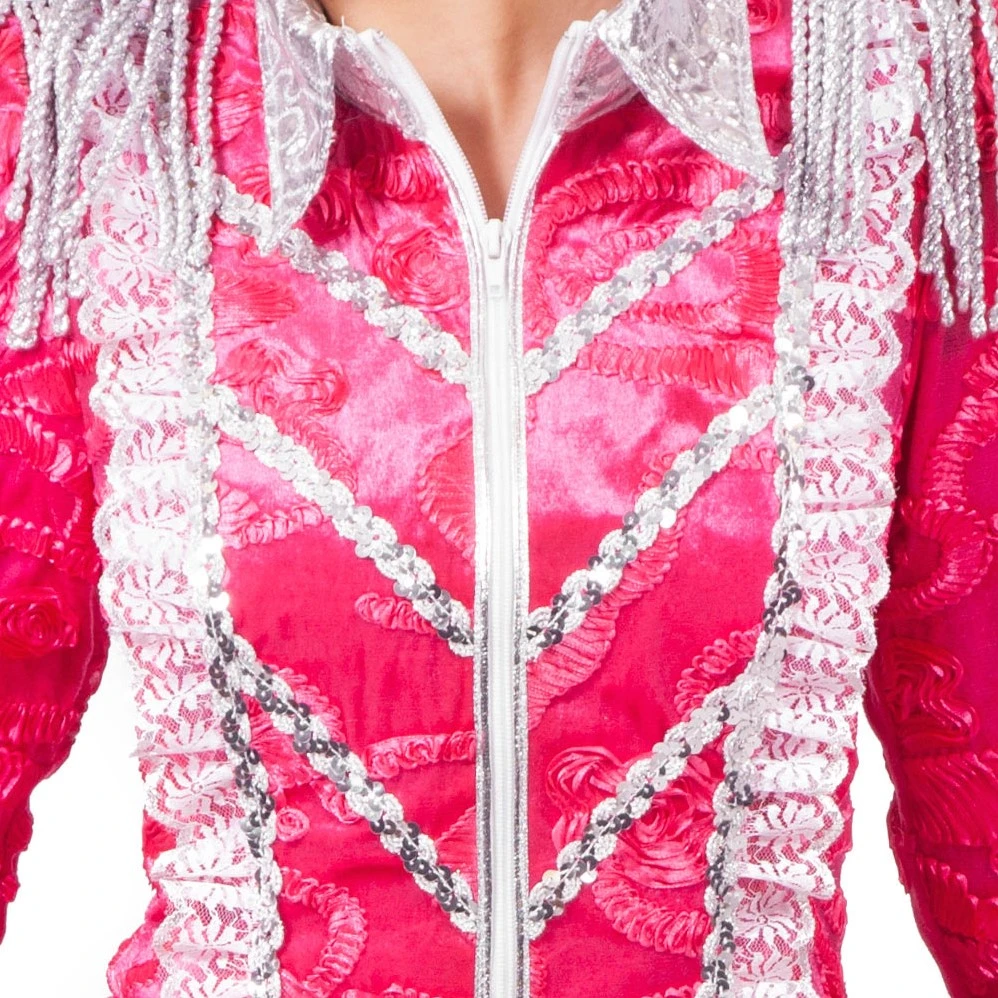 Details: zilveren kraag en mouwen. Ook de details zoals de epauletten en pailletten aan de voorkant zijn zilver. Tot slot zit er aan de voorkant en bij de mouwen nog een kanten detail