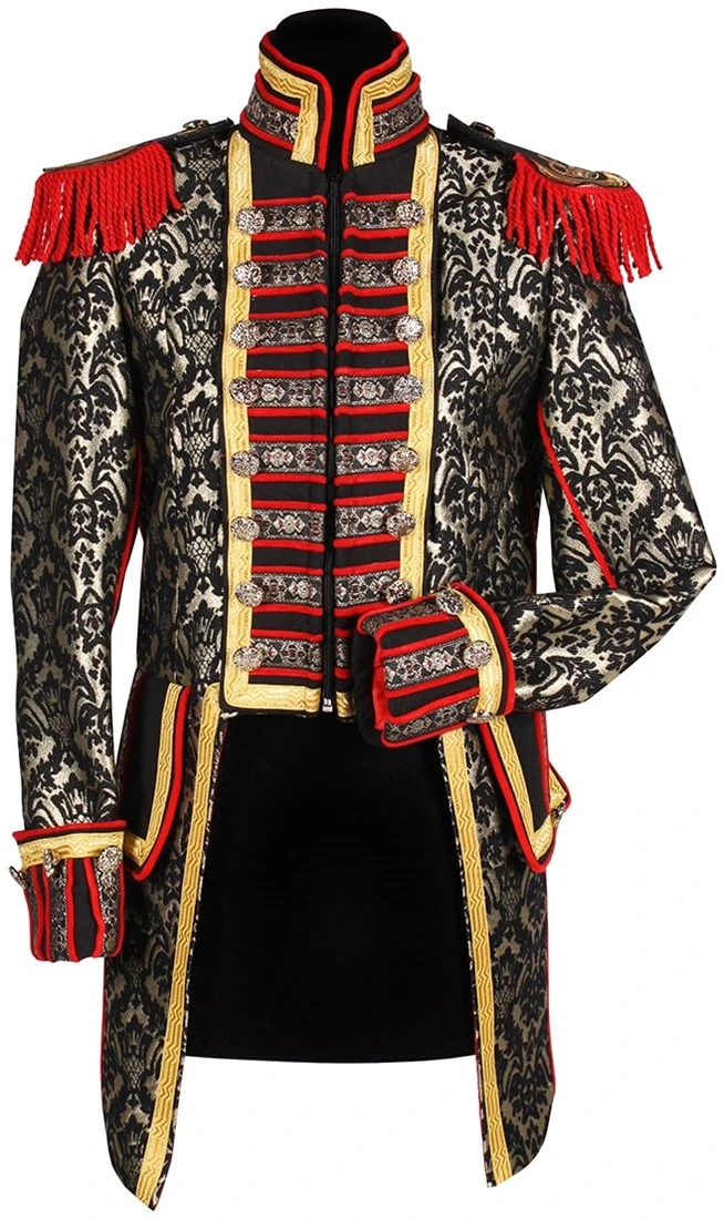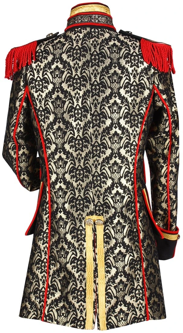 Details: opstaande boord en epauletten op de schouders. De borst, mouwen en zakken zijn versierd met gouden band en zilveren knopen