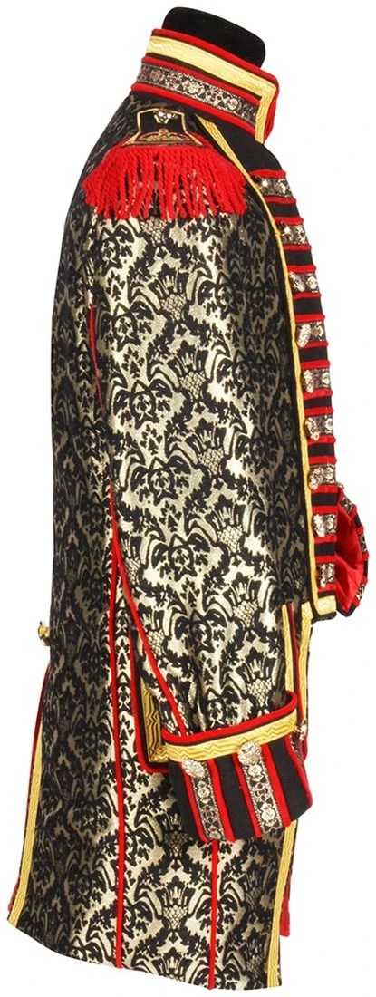 Details: opstaande boord en epauletten op de schouders. De borst, mouwen en zakken zijn versierd met gouden band en zilveren knopen