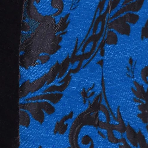 Deze gave blauwe carnavalsjas heeft een motief van zwarte brokaten borduursels. Een stoere jas voor heren om aan te hebben tijdens onder andere carnaval.