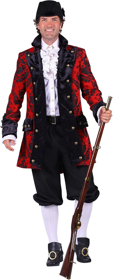 Deze gave rode carnavalsjas heeft een motief van zwarte brokaten borduursels. Een stoere jas voor heren om aan te hebben tijdens onder andere carnaval.