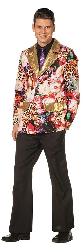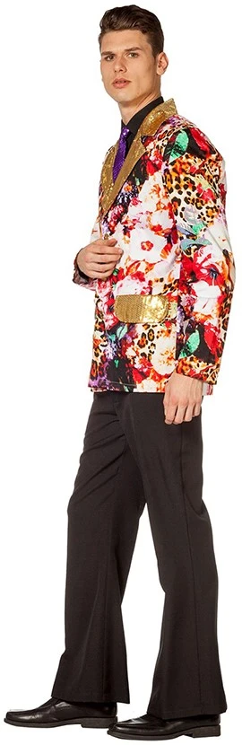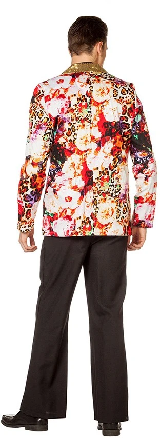 Leuke colbert met allemaal tijgerprints erop afgebeeld. De kraag en twee zakflappen zijn gemaakt van een gouden stof met pailletten erop.
