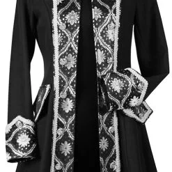 Mooie zwarte dames jas met vele zilveren accenten. De jas “Silver Bird” heeft bij de knopen, kraag, zakken en uiteindes van mouwen een zilveren patroon met bloemen. De jas heeft op de schouders zwart met zilveren epauletten. Deze worden inclusief geleverd.