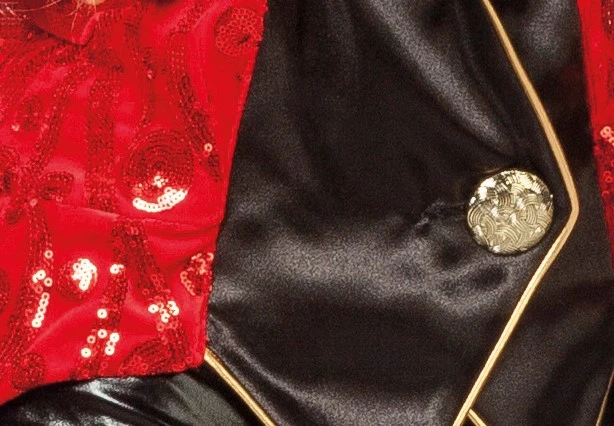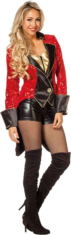 Rode showjas voor dames met gouden opdrukken en dicht te doen middels een knoop. Ook verkrijgbaar voor heren.