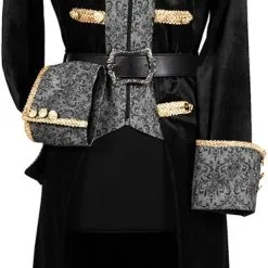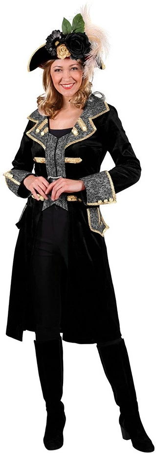 Een lange zwarte damesjas met allerlei gouden details zoals gouden lijnen en knopen. De jas is gemaakt van 100% polyester en wordt inclusief riem geleverd.