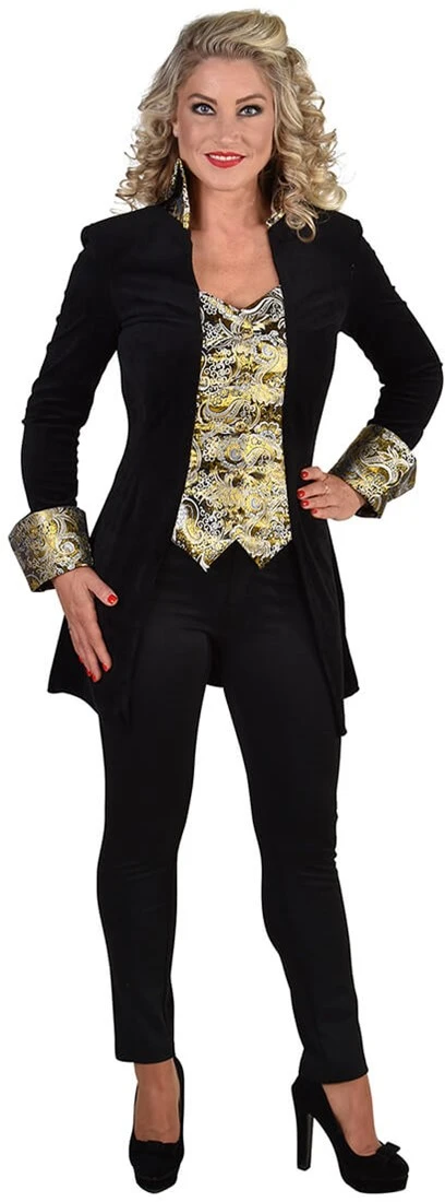 Details: de jas is gemaakt van nicky velours en de opstaande kraag, manchetten en borst heeft een brokaat motief
