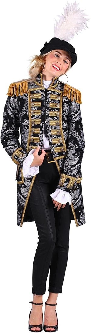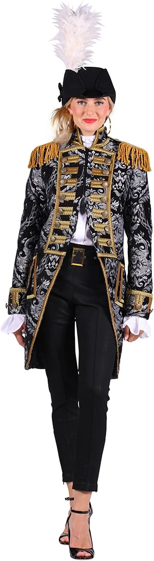 Details: op de schouders zitten gouden epauletten met goudkleurige franjes. Aan de voorzijde zitten voor de sier goudkleurige knopen. De jas is afgewerkt met goudband.