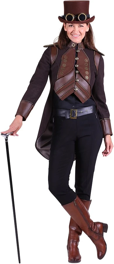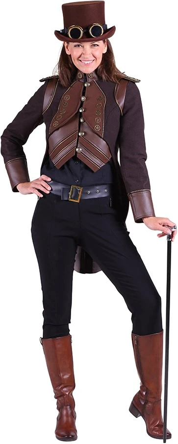 Steel de show met deze mooie steampunk jas. Het kostuum bestaat alleen uit een jas en heeft mooie details zoals bijvoorbeeld tandwielen aan de voorkant en rits details bij de kraag, mouwen en op de schouders. De jas gaat dicht door de gouden knopen die voor op de jas vast zitten. De jas heeft een look van wol en leer. De jas is gemaakt van 100% polyester. De Damesjas Steampunk Luxe Bruin bestaat uit: