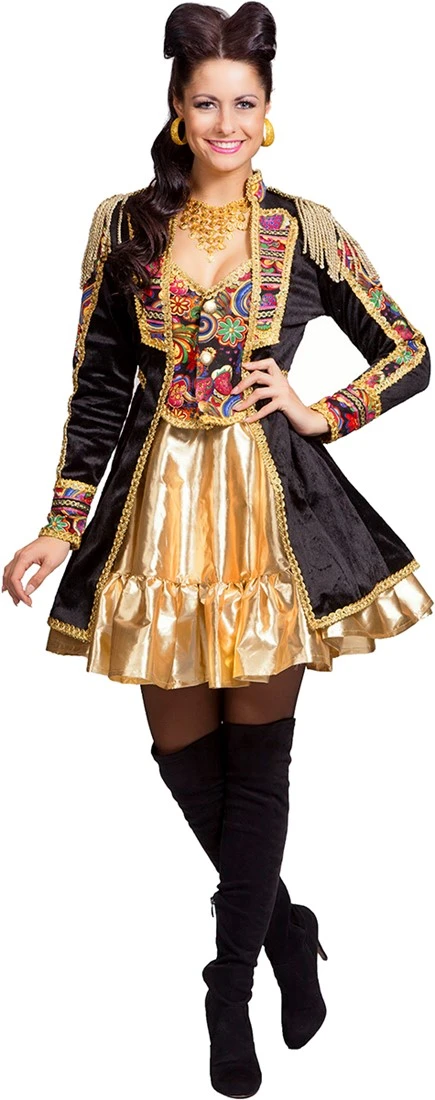 Een mooie elegante zwarte carnvalsjas! De jas is voorzien van een mooie vrolijk gekleurde patroon en details!