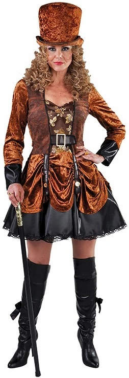 Een heel mooi ouderwets kostuum voor haar, in steampunk-stijl. Te gek voor fantasy-feesten. Mooie hoed en andere accessoires apart verkrijgbaar. Let op! Kostuums worden altijd geleverd zonder accessoires tenzij anders aangegeven.