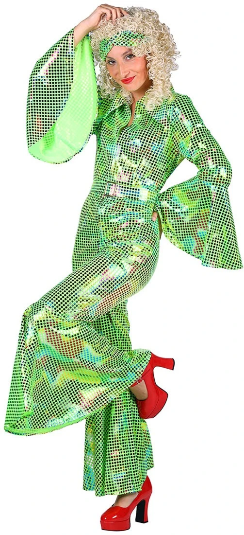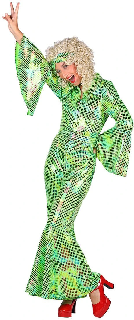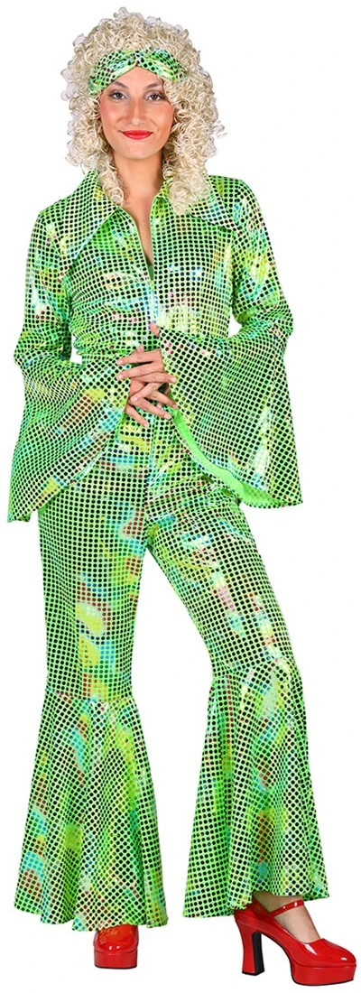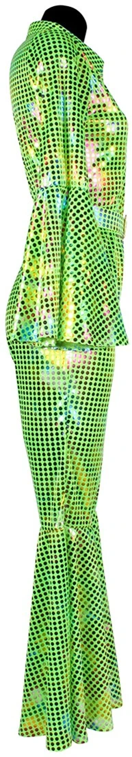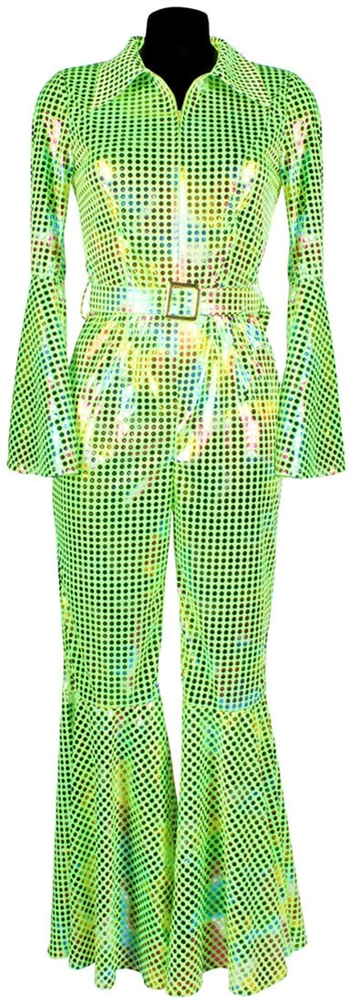 Details: pailletten over het gehele kostuum, uitlopende mouwen en broekspijpen