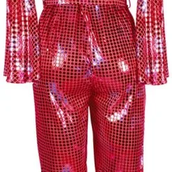 Details: pailletten over het gehele kostuum, uitlopende mouwen en broekspijpen