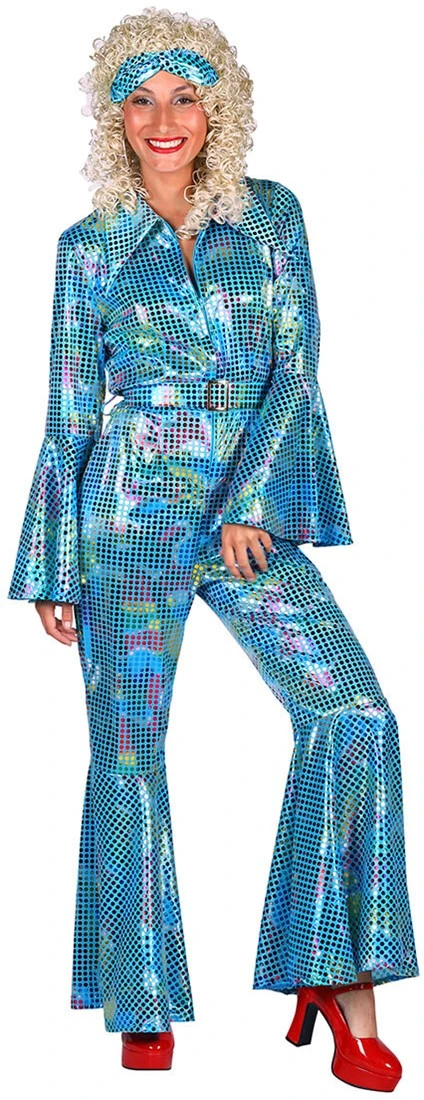 Details: pailletten over het gehele kostuum, uitlopende mouwen en broekspijpen