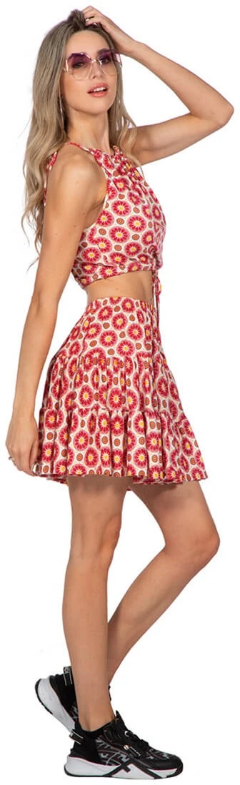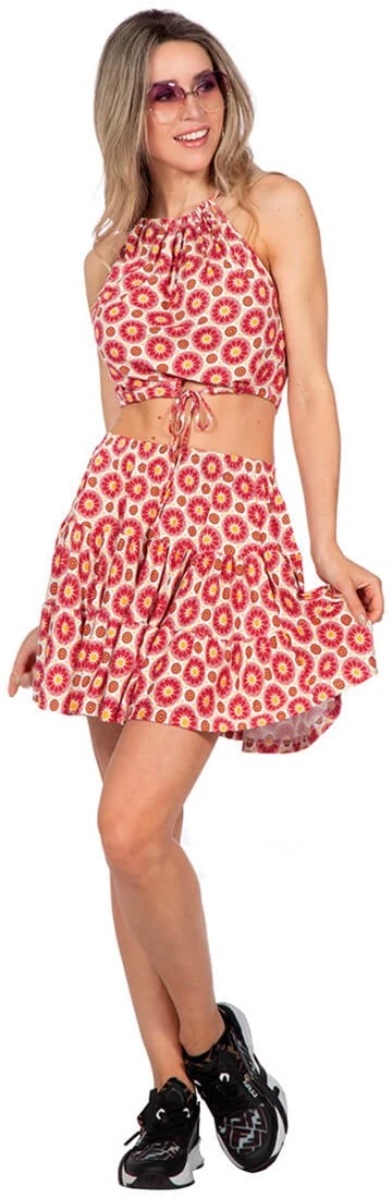 - Deze set bestaat uit een rok met stroken en een bijpassende halter top.