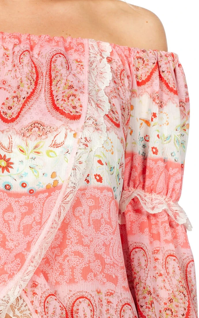 - Deze off shoulder blouse met een wijde 3/4 mouw is gemaakt van een soepel vallende en lichte zomerse stof. Afgewerkt met een luxe kant.