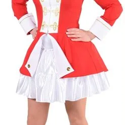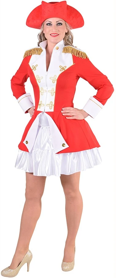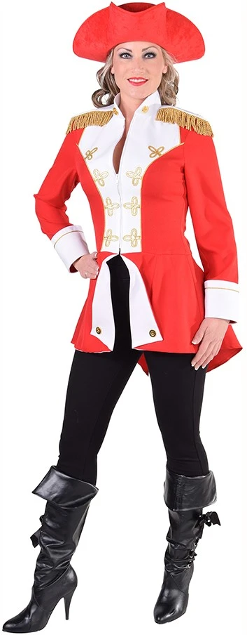 Een mooie rode admiraalsjas voor dames met witte epauletten en allerlei gouden details. De mantel bestaat uit de jas met lange achterkant. De afgebeele witte petticoat is apart verkrijgbaar. Het is gemaakt van 100% polyester/burlington.