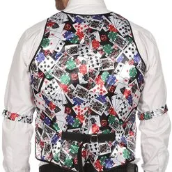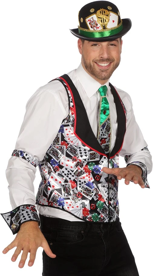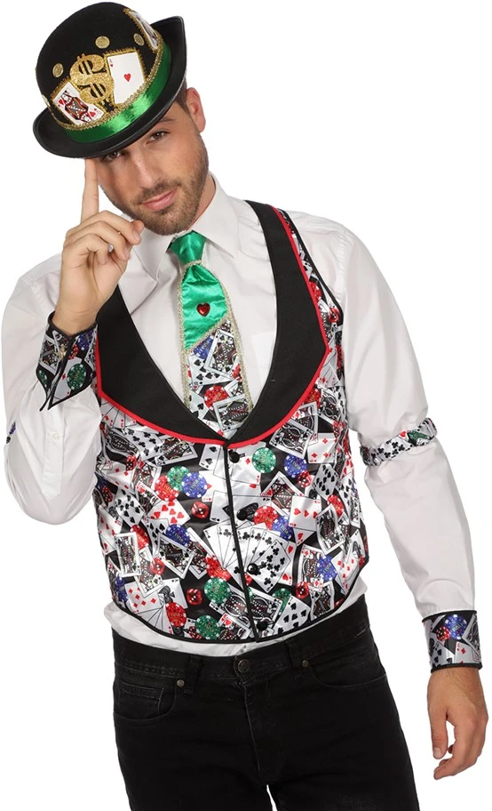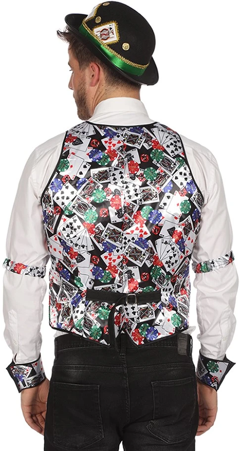 Patroon: een zwart vest met als opdruk kaarten, dobbelstenen en fiches