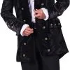 Prachtige zwarte markiezen jas voor heren. De jas is gemaakt van brokaat in combinatie met rekbare nicky velours. Aan de binnenzijde is de jas vanaf de heup naar beneden gevoerd met zilveren satijnen stof.