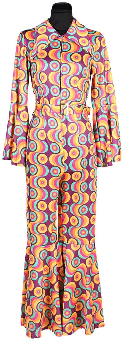 Details: grote puntige kraag en wijd uitlopende mouwen en broekspijpen