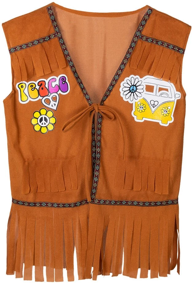 Details: op de borst zitten hippie afbeeldingen van een bus, bloemen en peace teken. Bij de schouders, zakken en onderkant hangen franjes