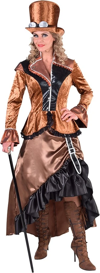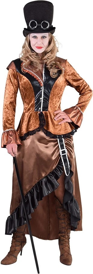 Mooie steampunk jurk met een bronzen kleur. Het bovenstuk zit vast aan de rok. Gemaakt van 100% polyester. Let op: exclusief accessoires.