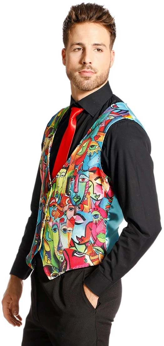 Een gaaf gilet voor heren, met een Picasso-print. Op de print zie je de typerende kubistische gezichten en relle kleuren die vroeger door Picasso gebruikt werden. De voering en de achterkant zijn beide turquoise met een satijnen look&feel. Het vest is te sluiten met 3 knopen bij de middel.